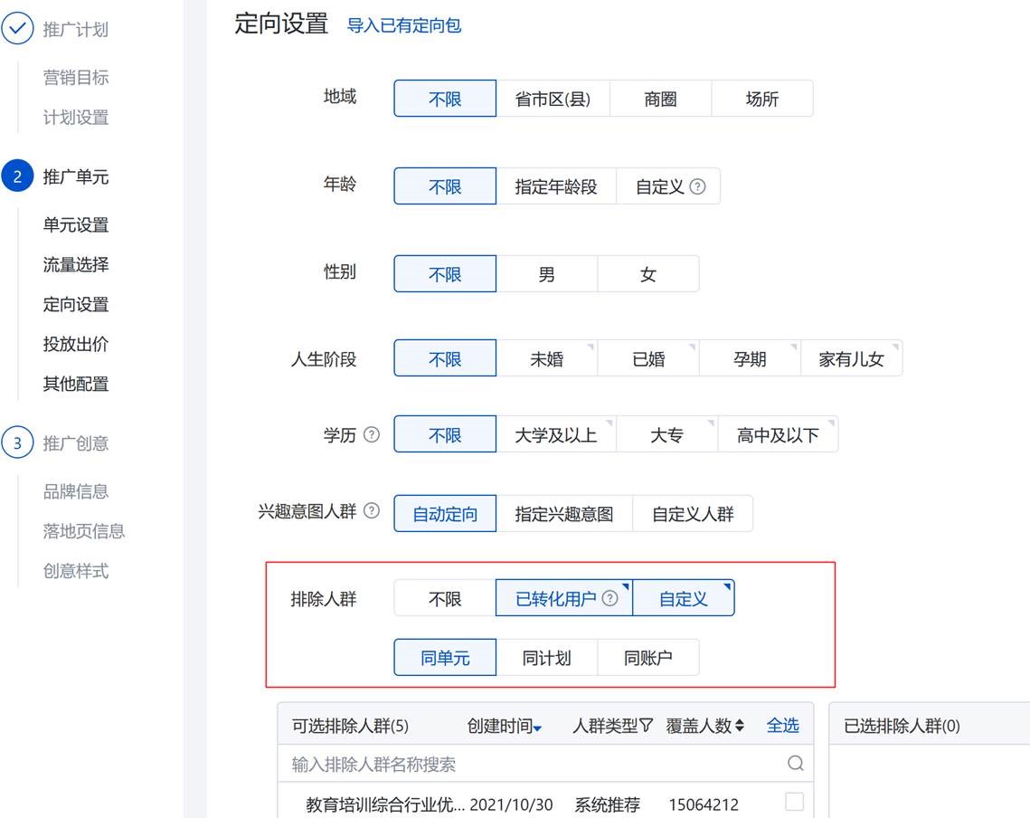 将排除已转化用户与原人群包设置中的排除人群合并为排除人群,包括:不限、已转化用户、自定义,选项可复选,如下图所示。
