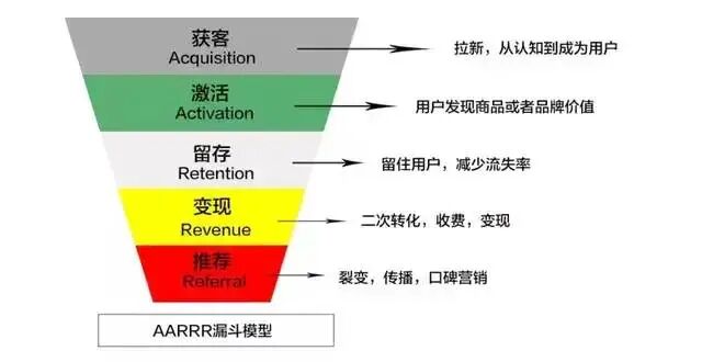 AARRR是Acquisition、Activation、Retention、Revenue、Referral,这个五个单词的缩写,分别对应用户生命周期中的5个重要环节。